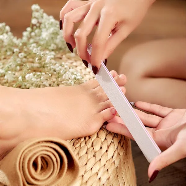 Short on time? We can still help you achieve healthy, glowing feet. This service offers filing, buffing, cuticle care. We use sugar scrub to exfoliate your legs and feet. Next, a hot towel is applied and a calming massage. It concludes with a polish of your choice.